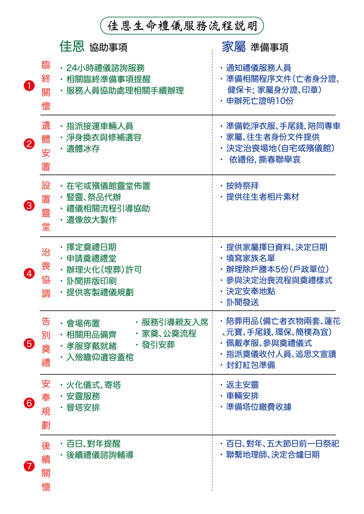 我們能夠依照您 / 親屬 的需求、生前喜好,打造專屬獨一無二的客製禮儀服務,讓您 / 親人的喪禮能夠貫串個人特質與信念,好好的懷念、永遠的思念那個我們最愛的彼人。